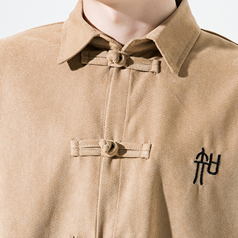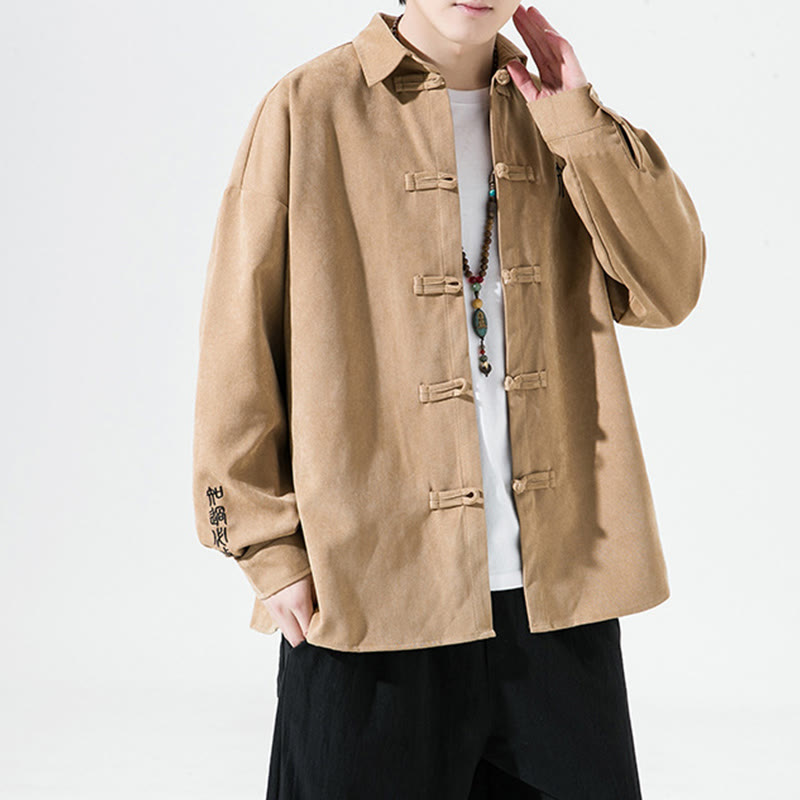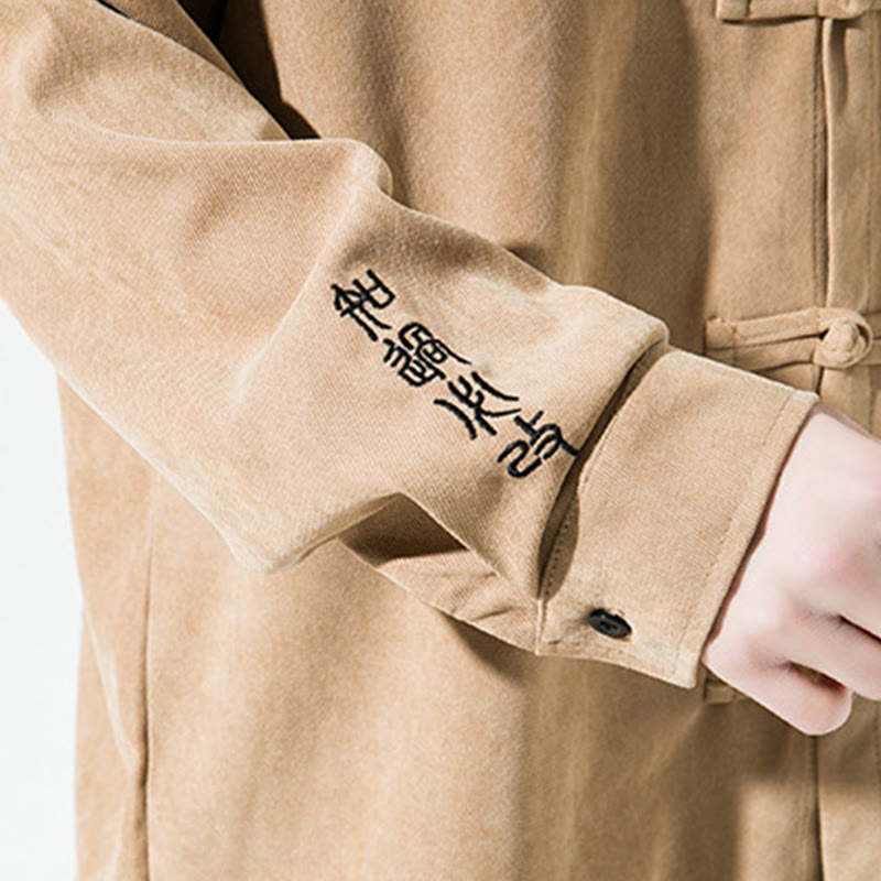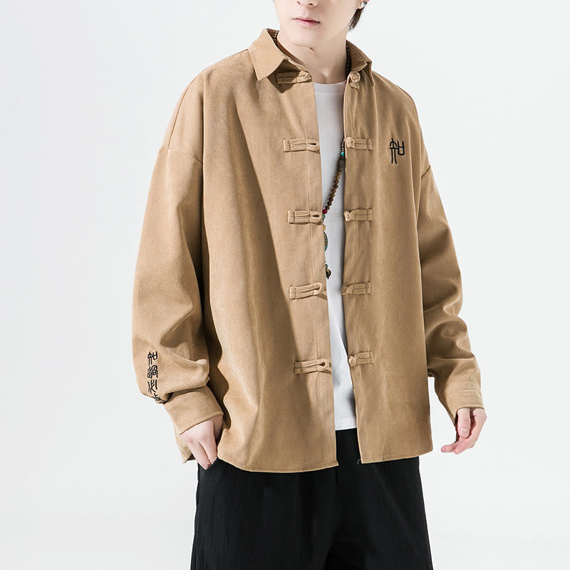 Buddha Stones Embroidery Chinese Frog-Button Design Tang Suit Men's Cotton Long Sleeve Jacket Shirt