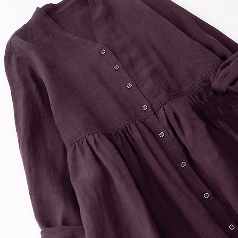 Buddha Stones Fall DarkMagenta V-Neck Buttons Design Cotton Long Sleeve Midi Dress