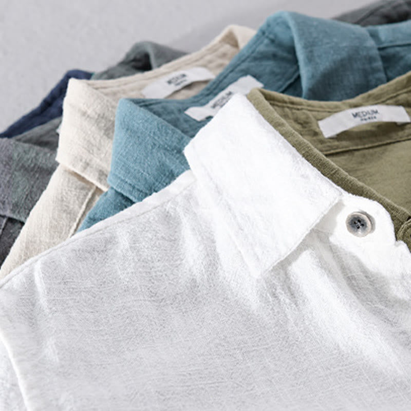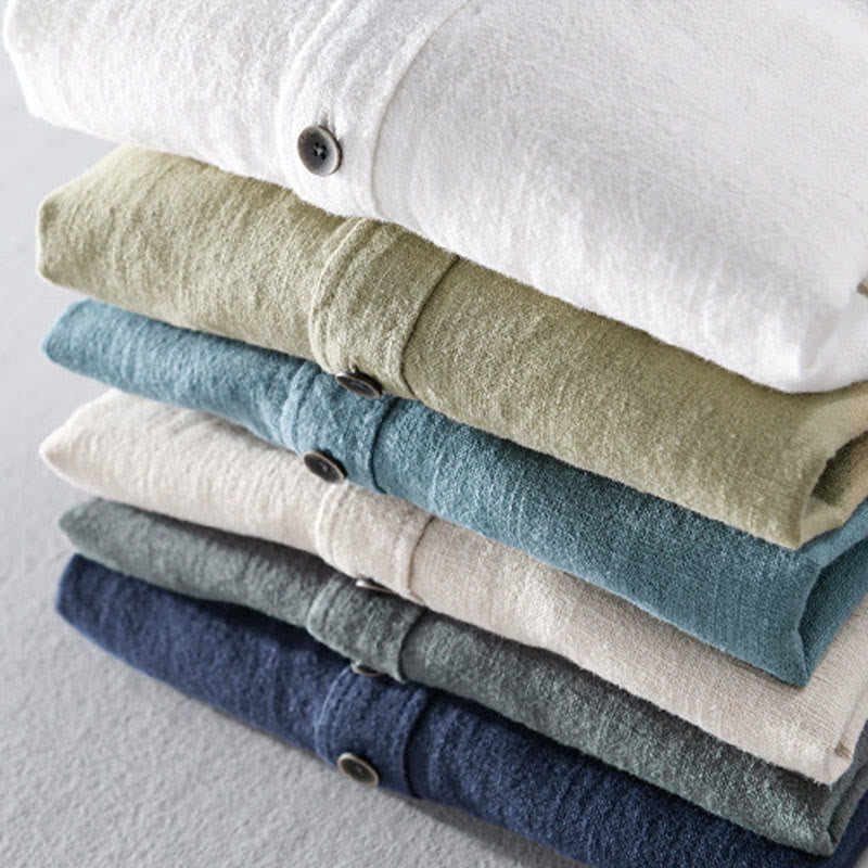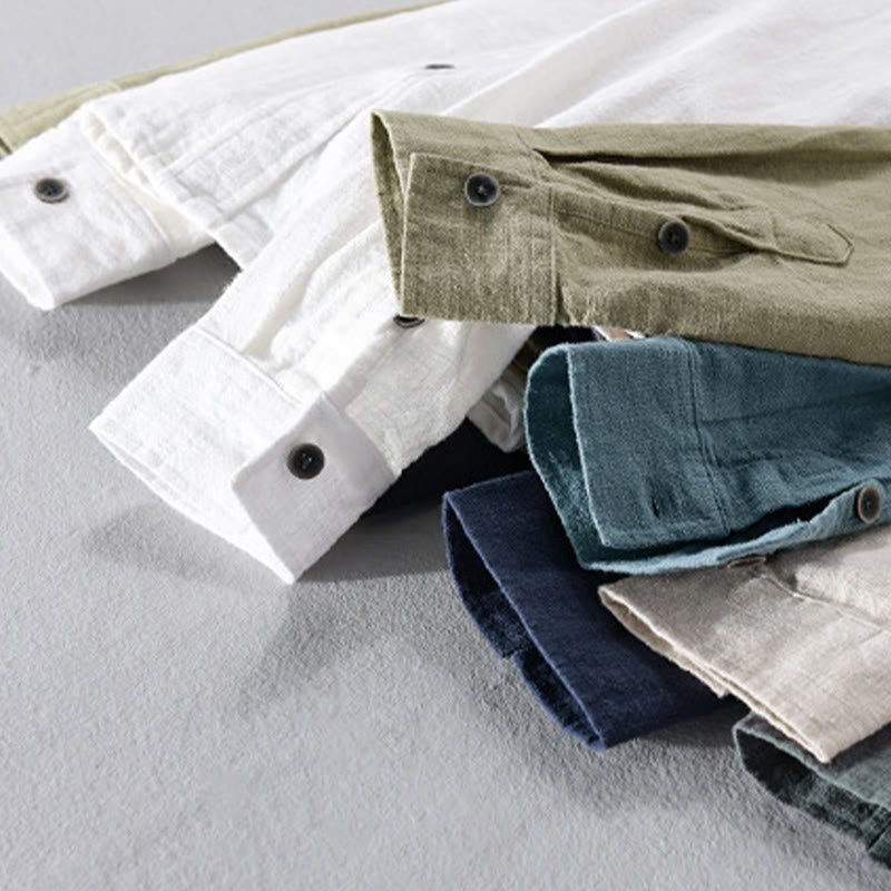 Buddha Stones Men's Pure Color Lapel Buttons Simple Design Ramie Cotton Long Sleeve Shirt