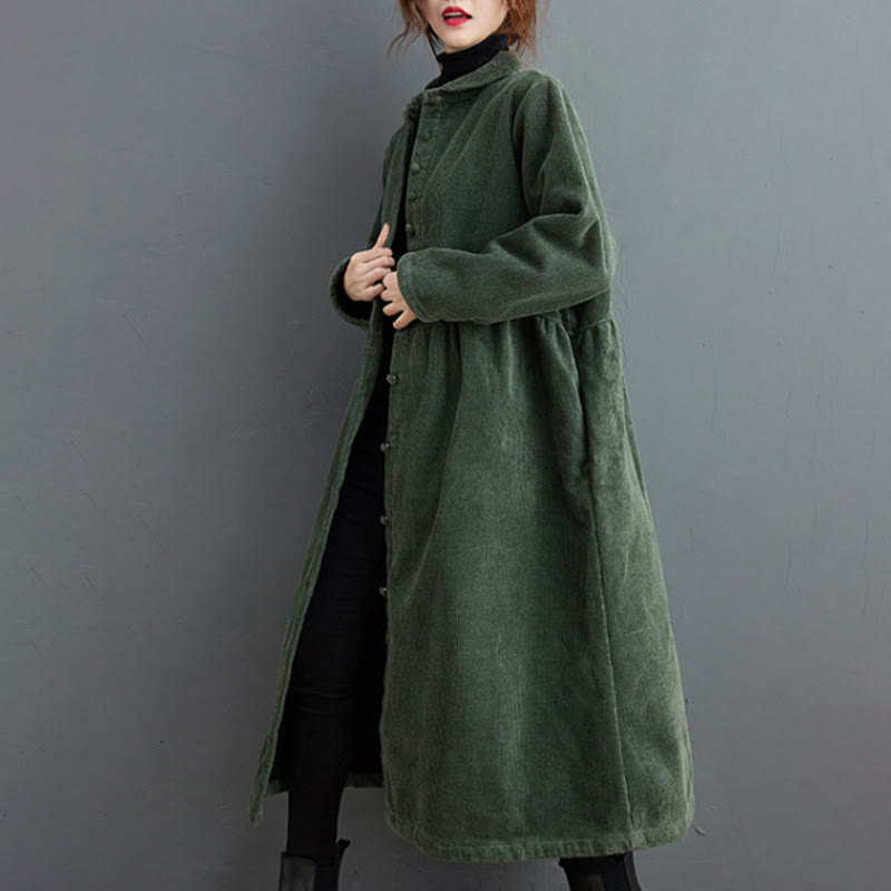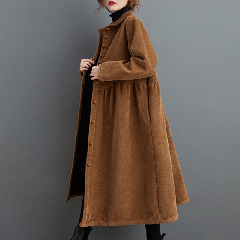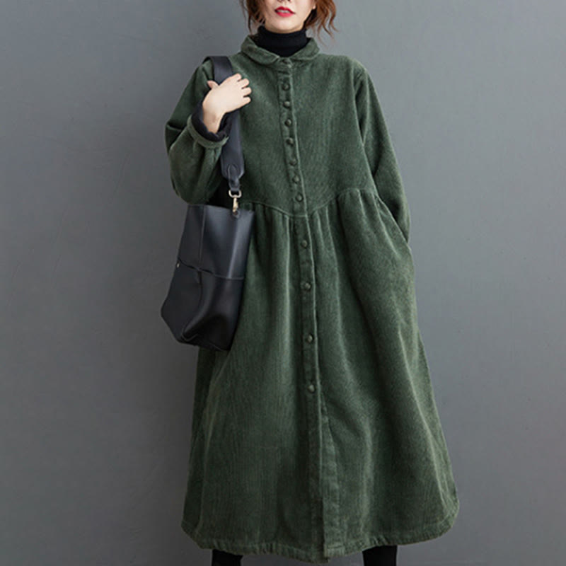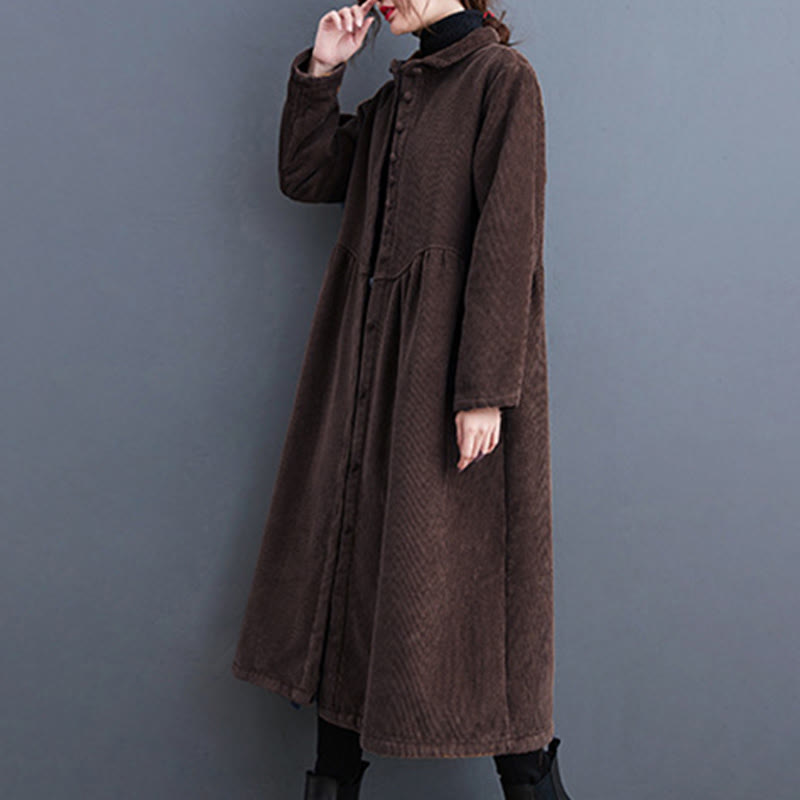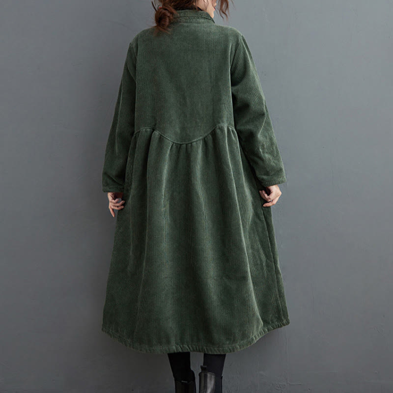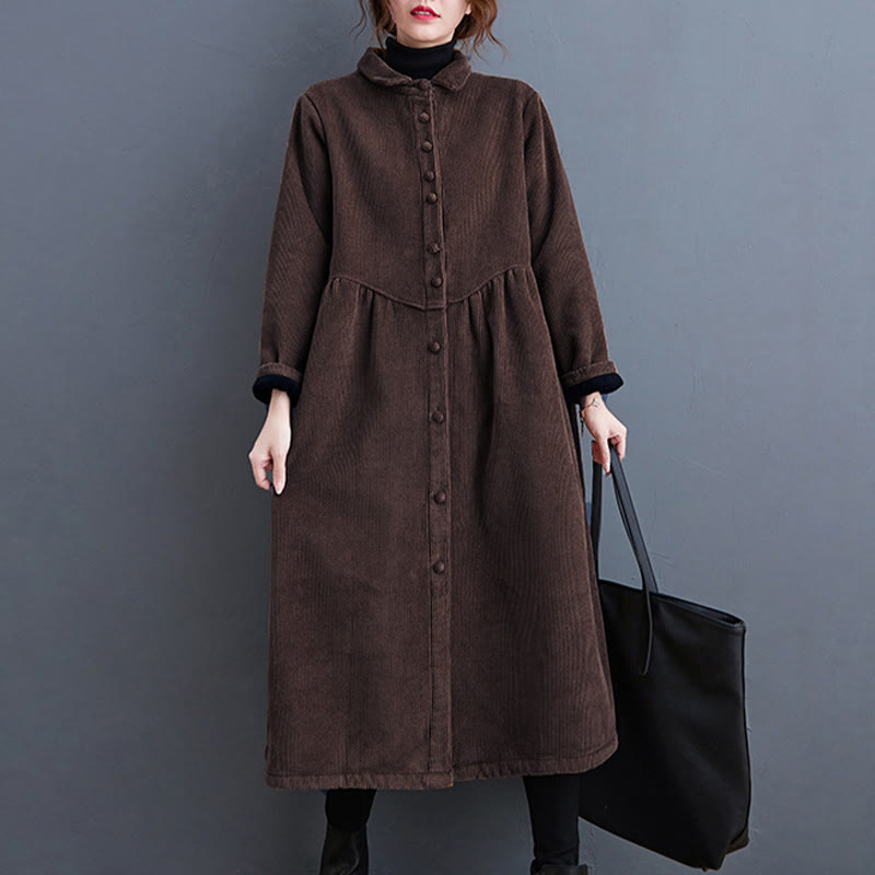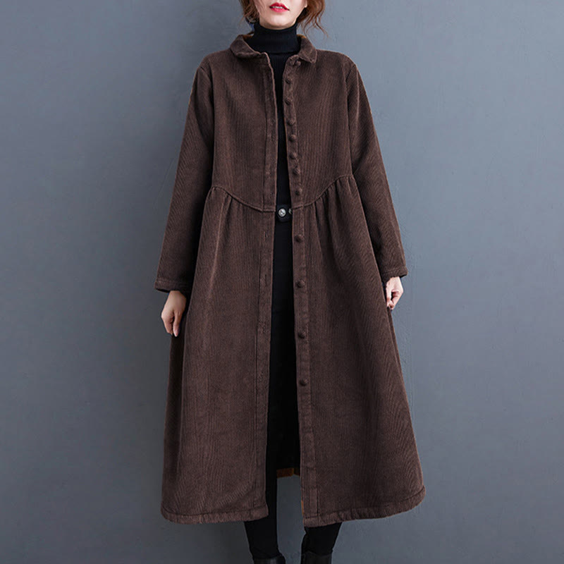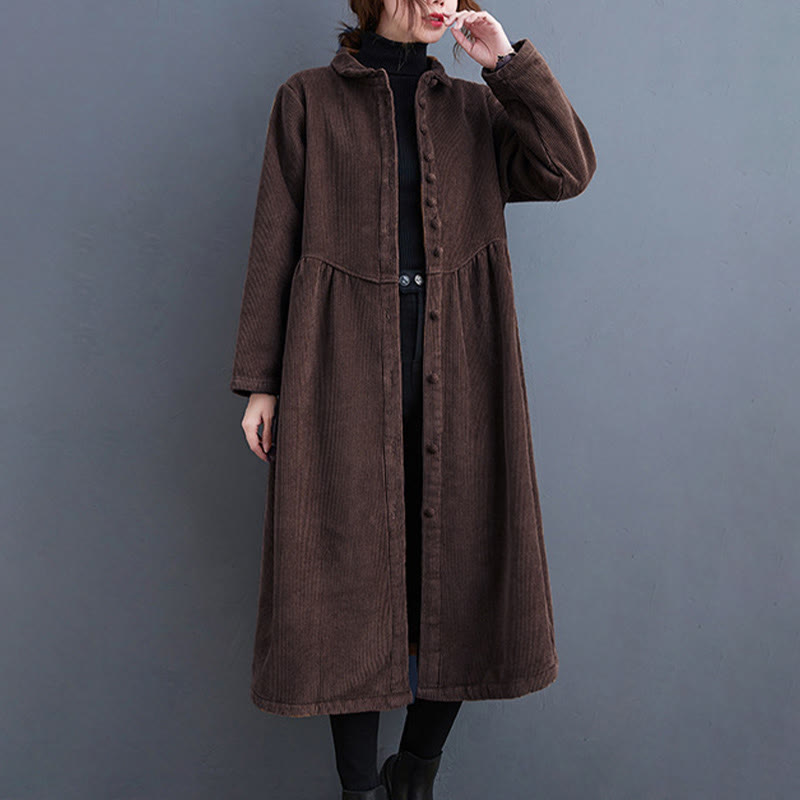 Buddha Stones Plain Buttons Long Sleeve Women's Cotton Corduroy Fleece-Lined Coat With Pockets
