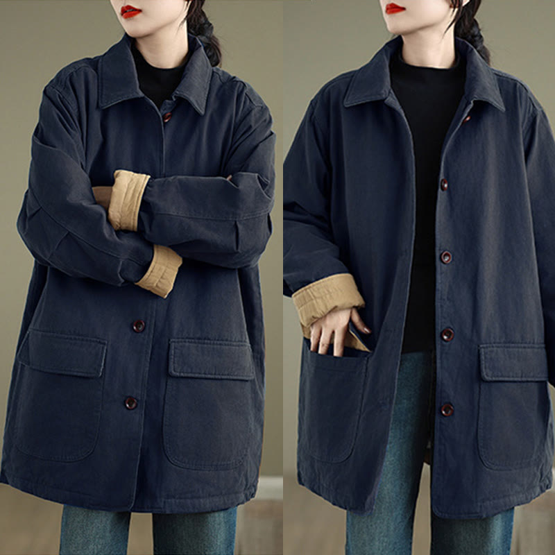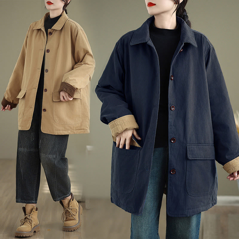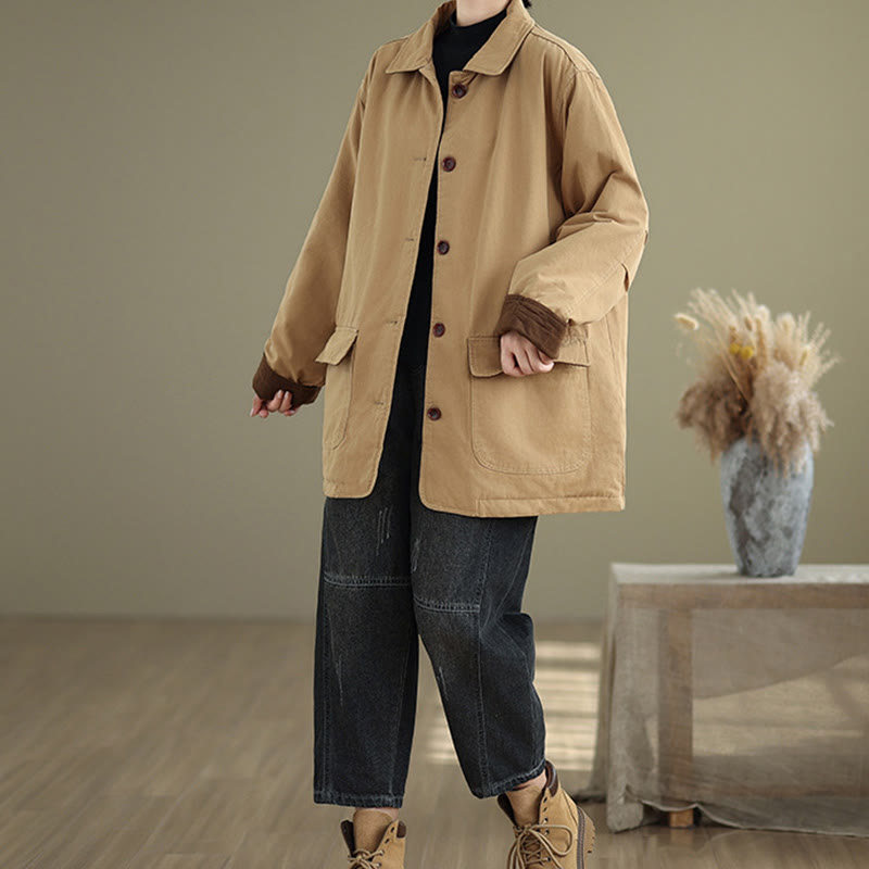Buddha Stones Plain Lapel Buttons Design Women's Long Sleeve Quilted Cotton Jacket With Pockets