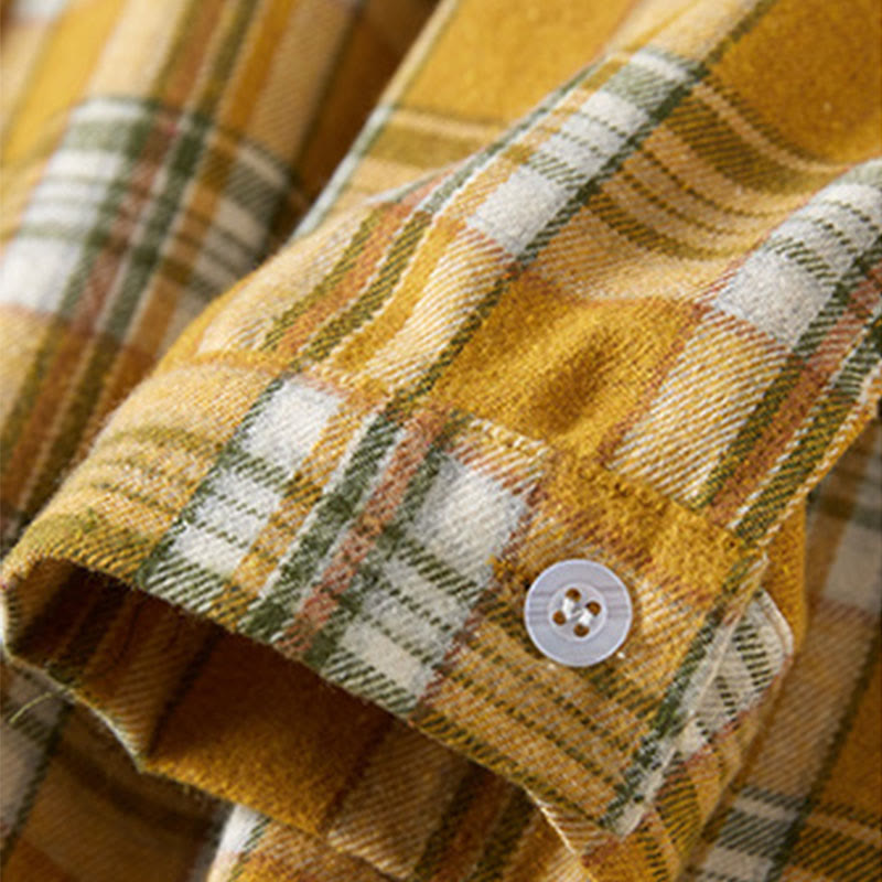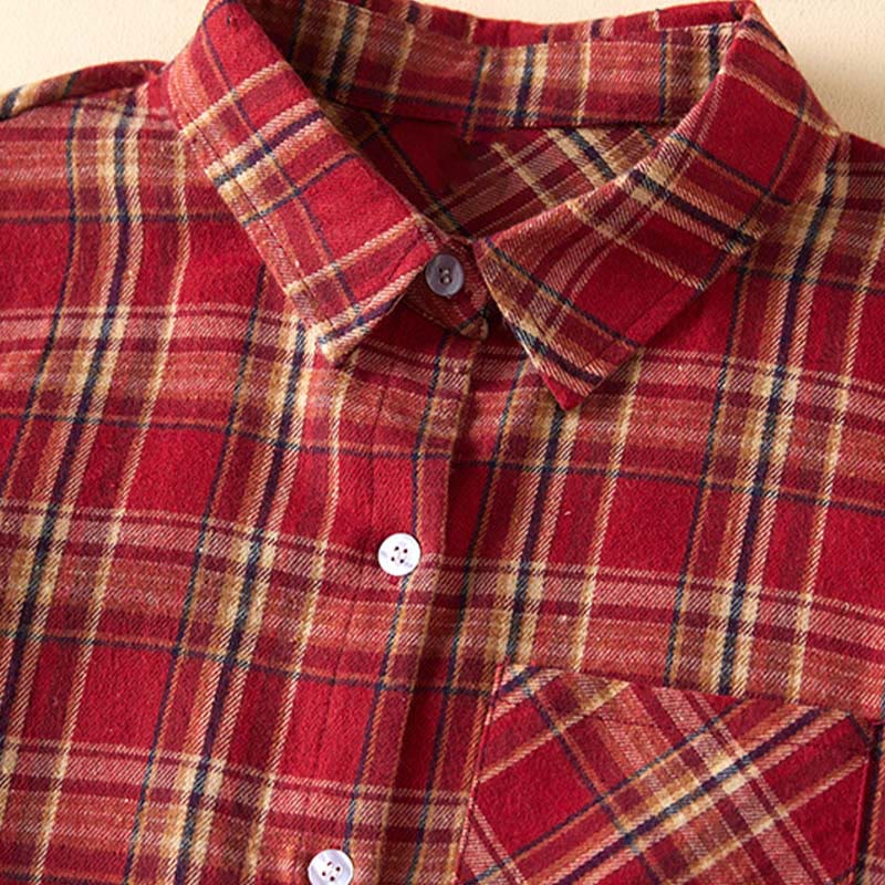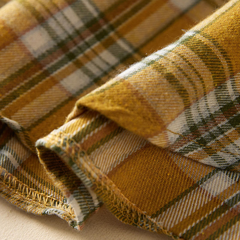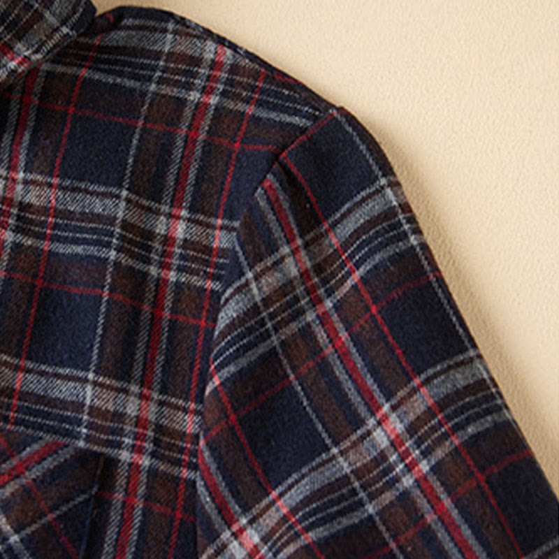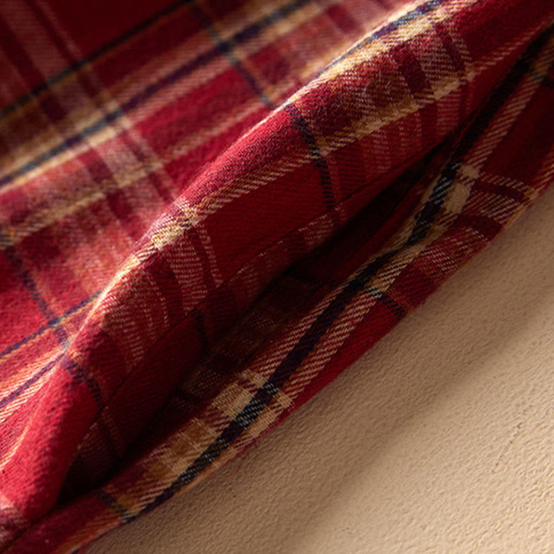 Buddha Stones Spring Color Contrast Plaid Pattern Lapel Long Sleeve Cotton Midi Dress With Pockets