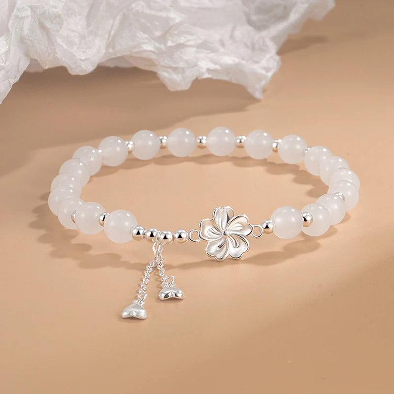 Buddha Stones White Jade Peach Blossom Petals Flower Luck Bracelet